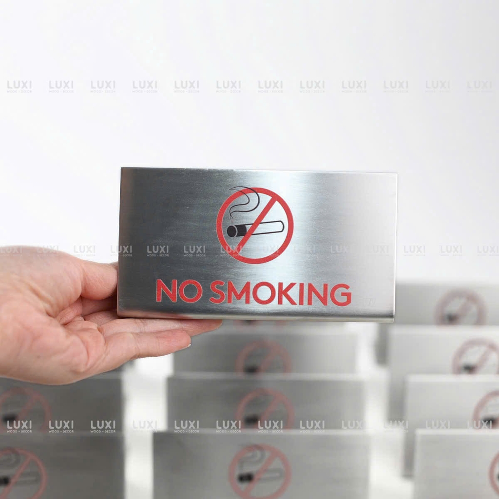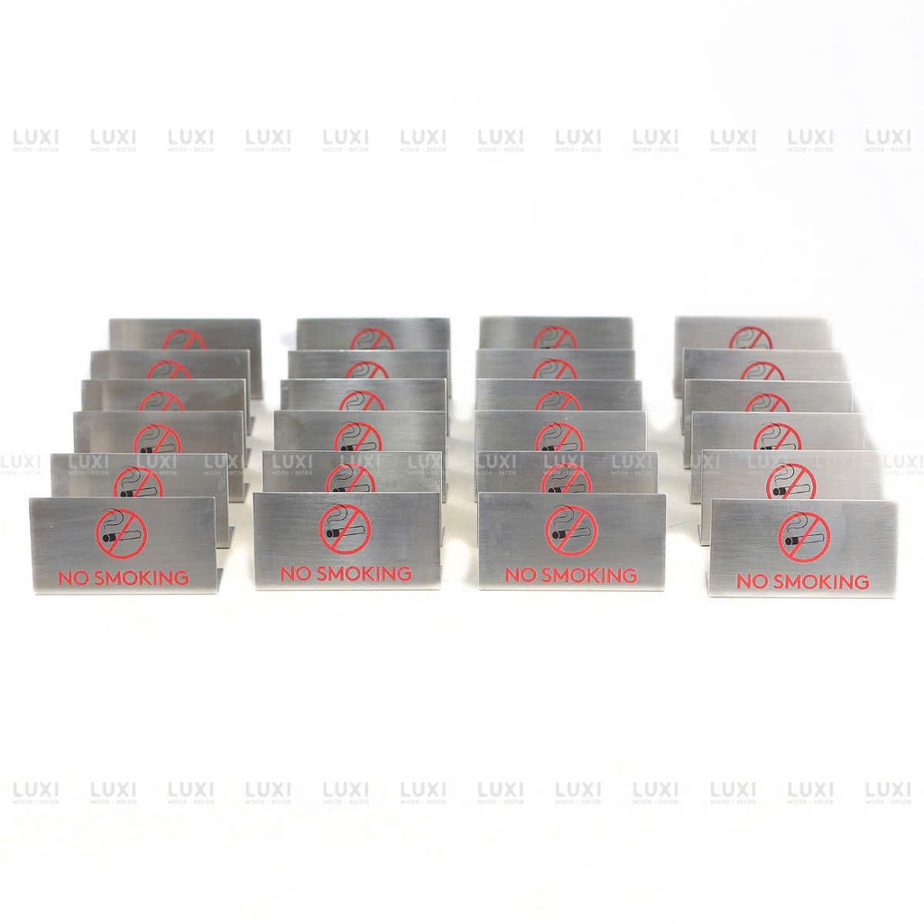 Bảng cấm hút thuốc inox hình chữ L thiết kế tiện lợi, dễ dàng đặt trên bàn, quầy lễ tân hoặc khu vực cần nhắc nhở.