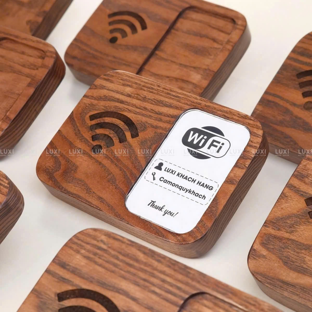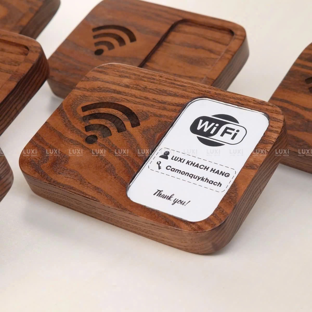 Bảng Wifi trang trí tại quầy, tại bàn làm bằng chất liệu Gỗ Sồi. Và được thiết kế bằng tấm mica, có thể dễ dàng tháo gỡ và thay đổi nội dung nếu cần. Giúp khách dễ dàng kết nối wifi mà không cần hỏi nhân viên. Tăng sự chuyên nghiệp và tạo điểm nhấn trang trí cho không gian của bạn.
