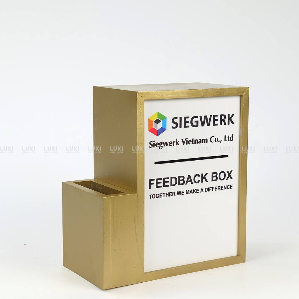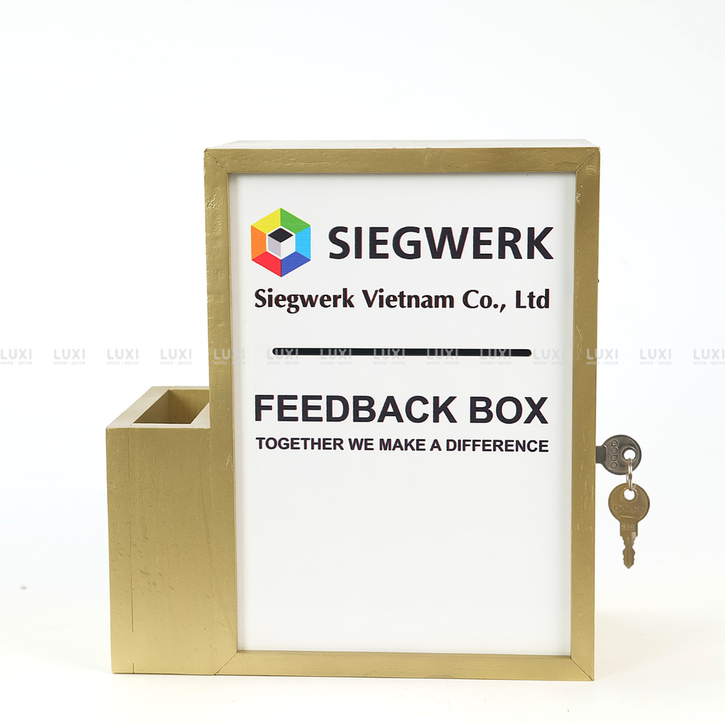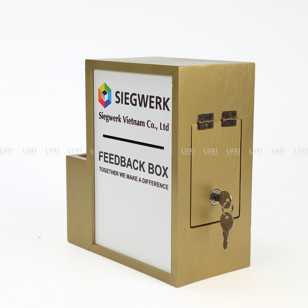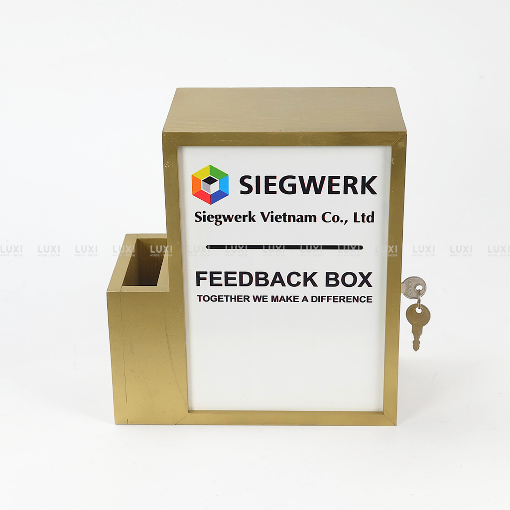 Điểm nổi bật của sản phẩm chính là phần cửa lấy thư tích hợp ổ khóa gắn bên hông, thiết kế dạng nắp bật ngang, dễ dàng thao tác bằng một tay. Nắp được liên kết bằng bản lề thép chắc chắn và khóa cơ nhỏ gọn, đảm bảo an toàn tuyệt đối cho các phiếu góp ý bên trong.