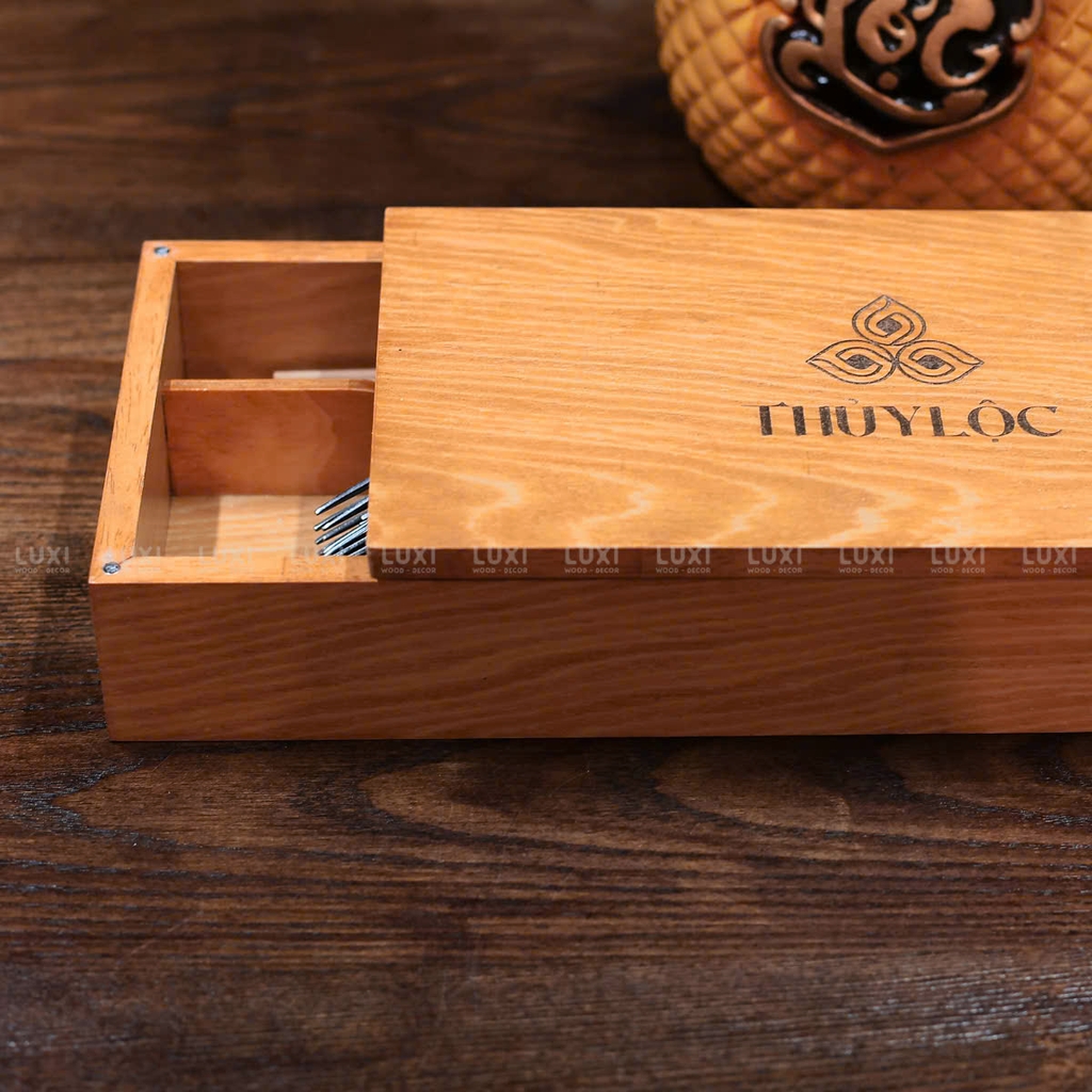 Chiếc khay gỗ 2 ngăn được thiết kế tối giản, tách riêng đũa – muỗng – nĩa gọn gàng, sạch sẽ. Không còn cảm giác lộn xộn, mọi thứ đều nằm đúng chỗ – như cách một không gian chuyên nghiệp nên có.